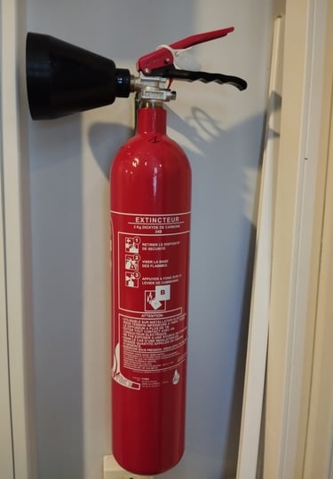 Les extincteurs au dioxyde de carbone (CO2)(B) : adaptés aux feux de liquides et aux feux électriques. Le dioxyde de carbone remplace l’oxygène autour du feu, ce qui étouffe les flammes.