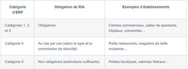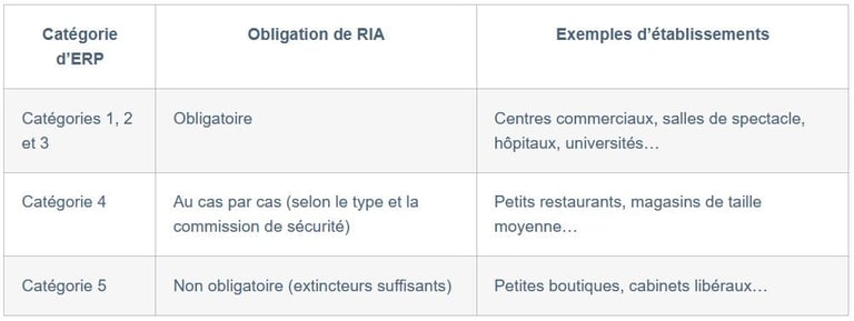 La réglementation est précise. L’obligation d’installation d’un RIA ne s’applique pas systématiquement à tous les ERP, mais à des configurations spécifiques.